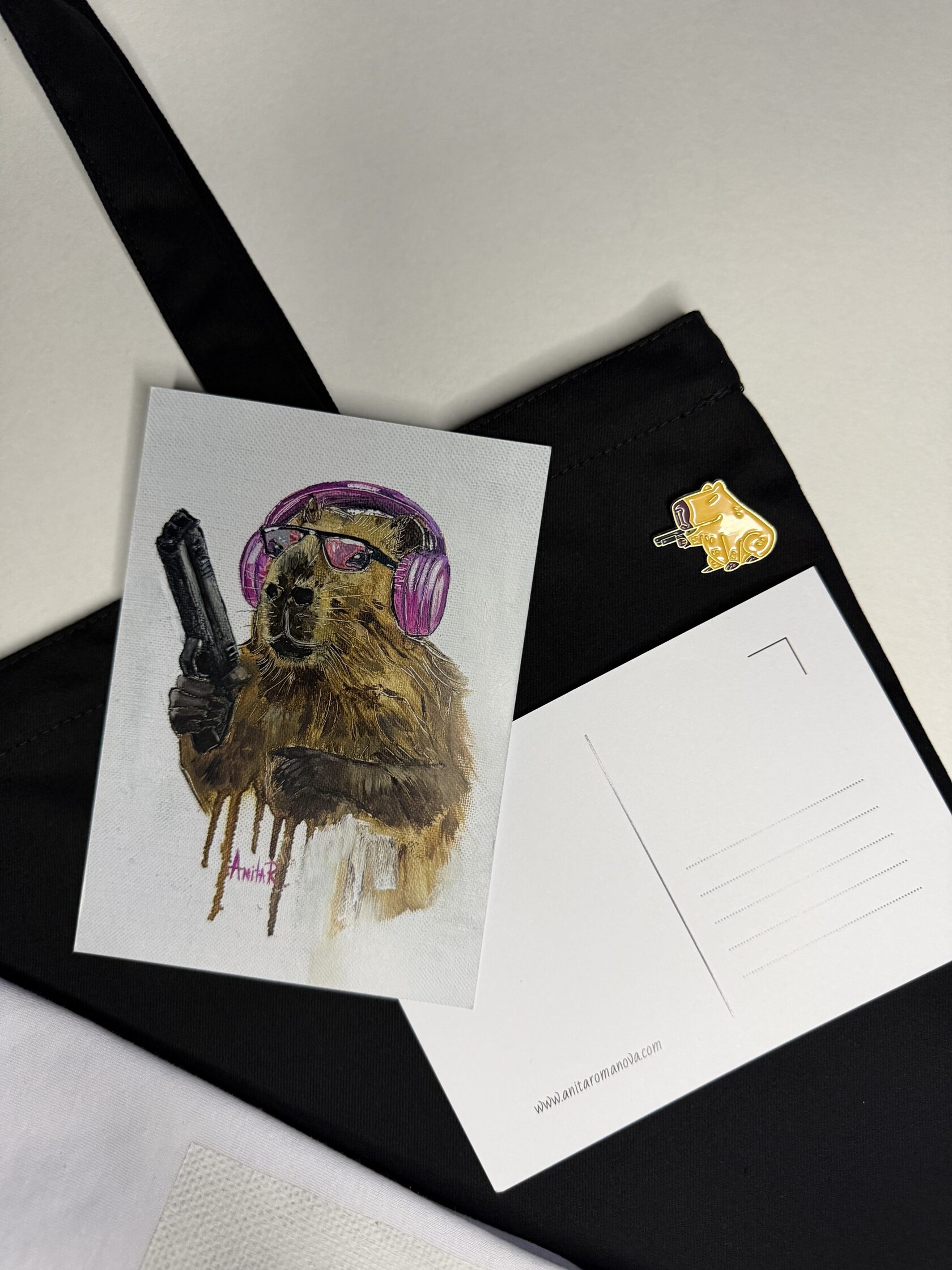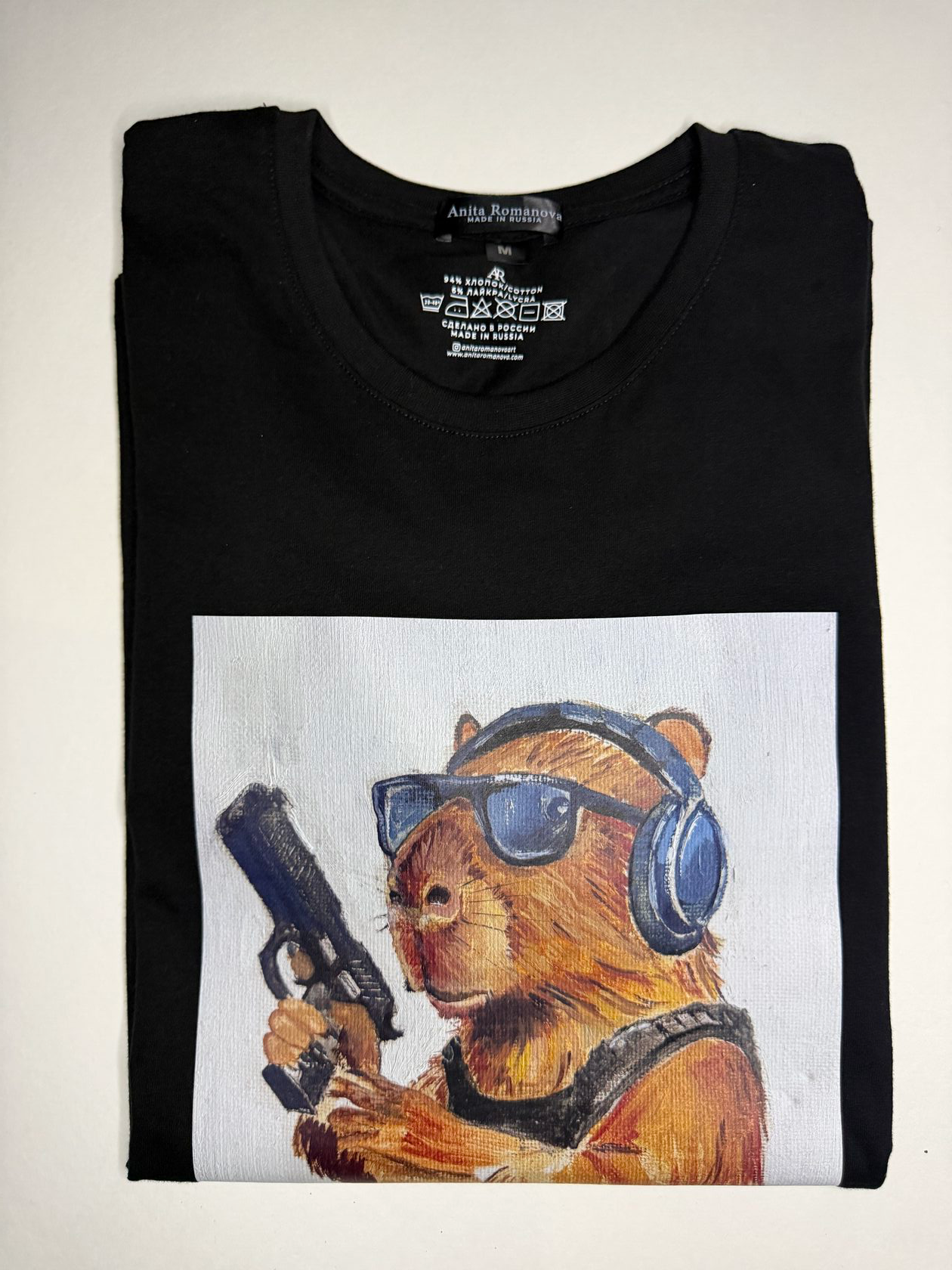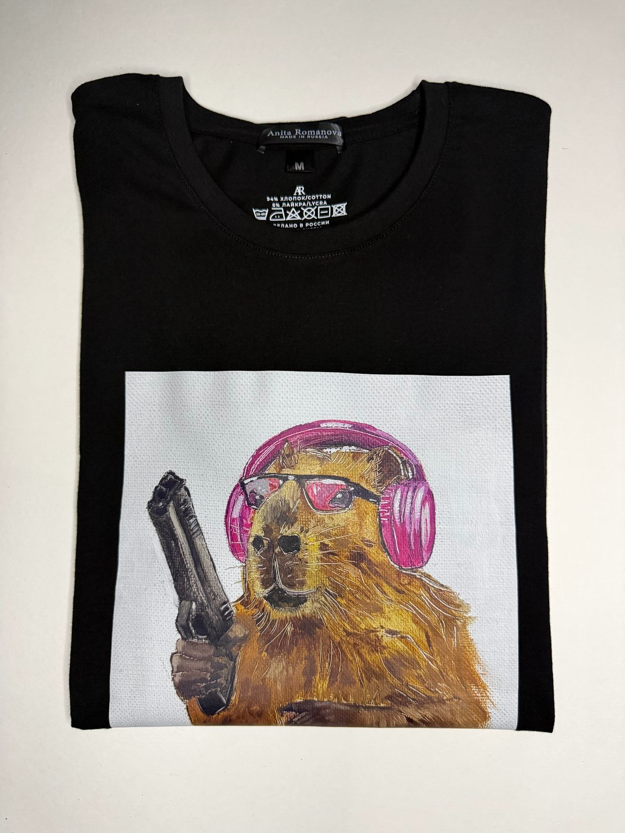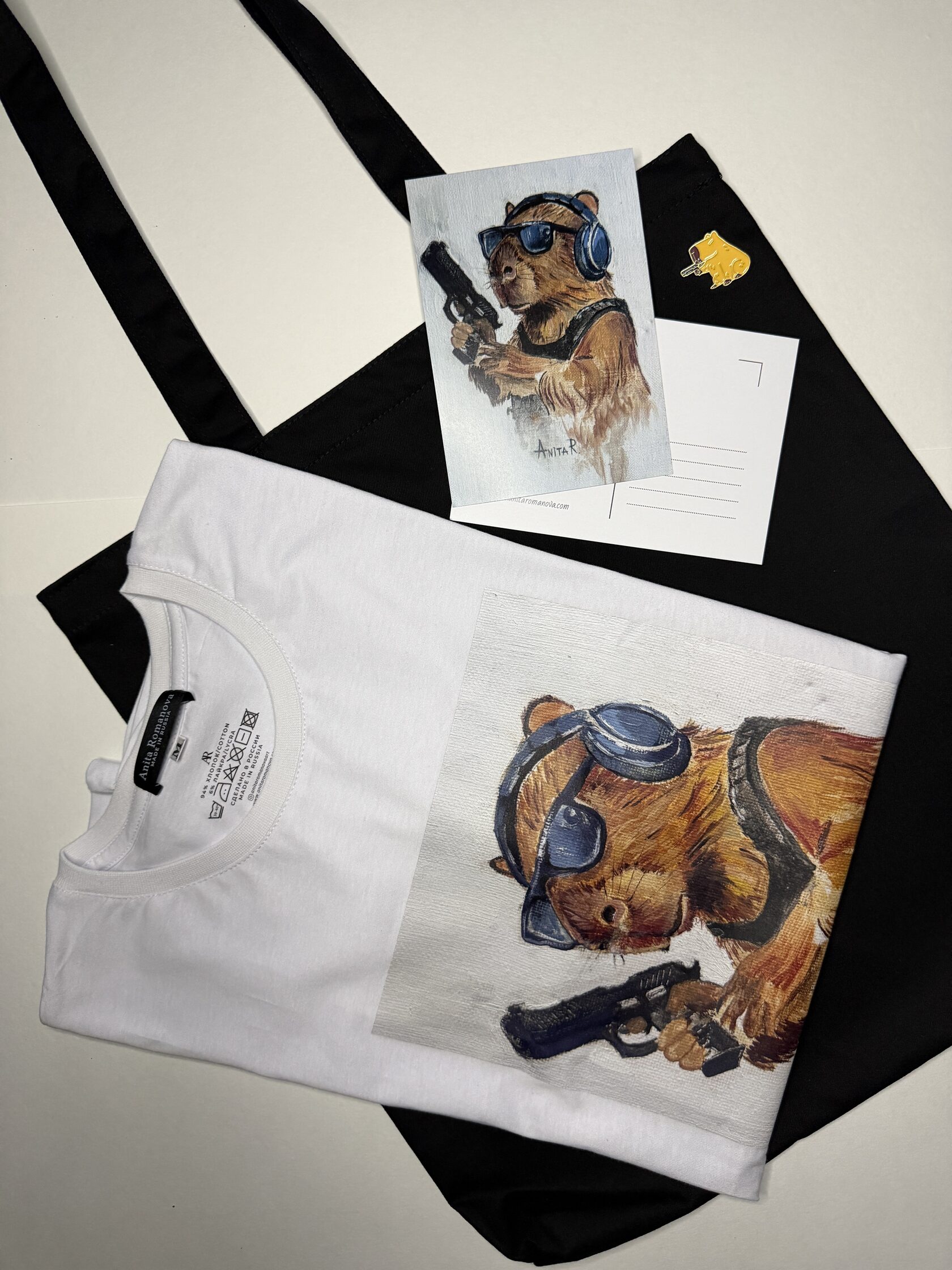Комплектация товара: футболка, открытка с выбранным принтом, пакет zip-lock, шоппер, значок капибары.