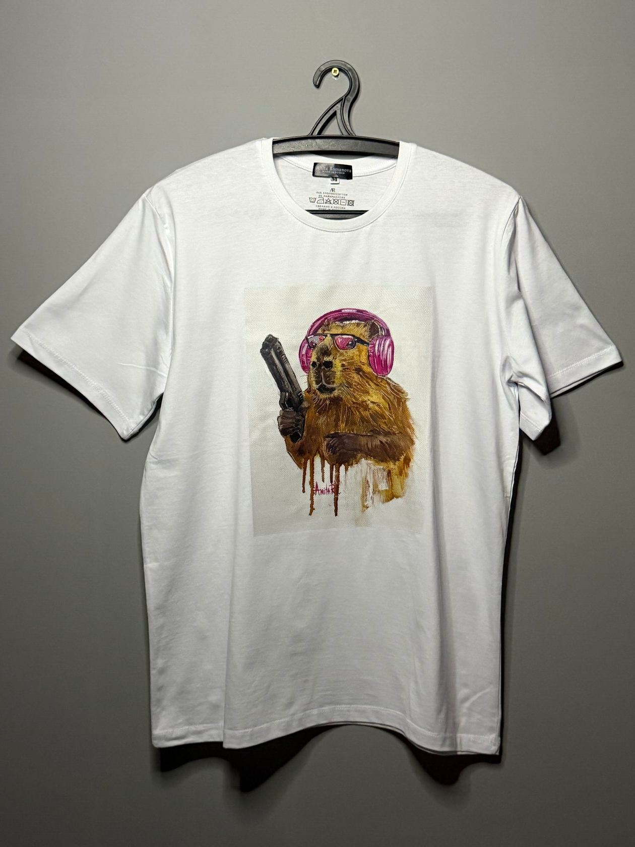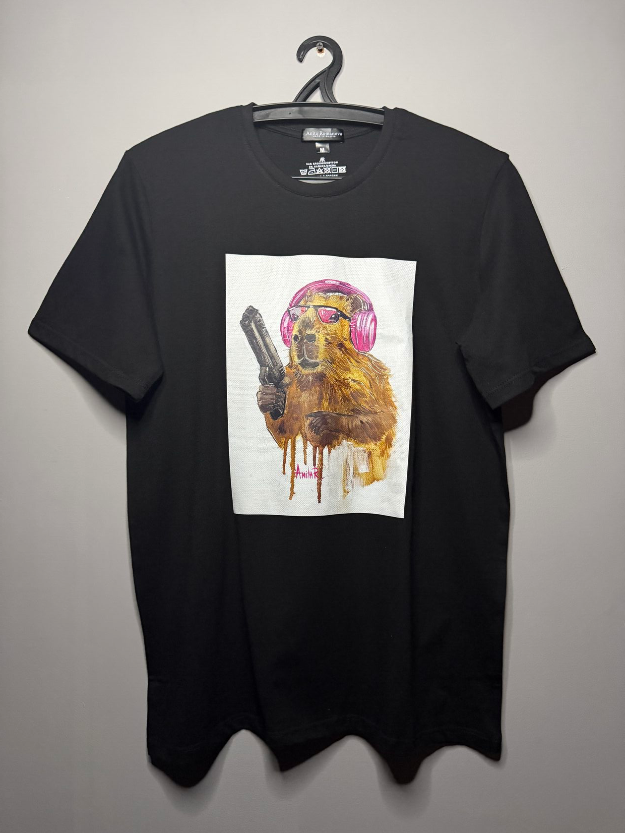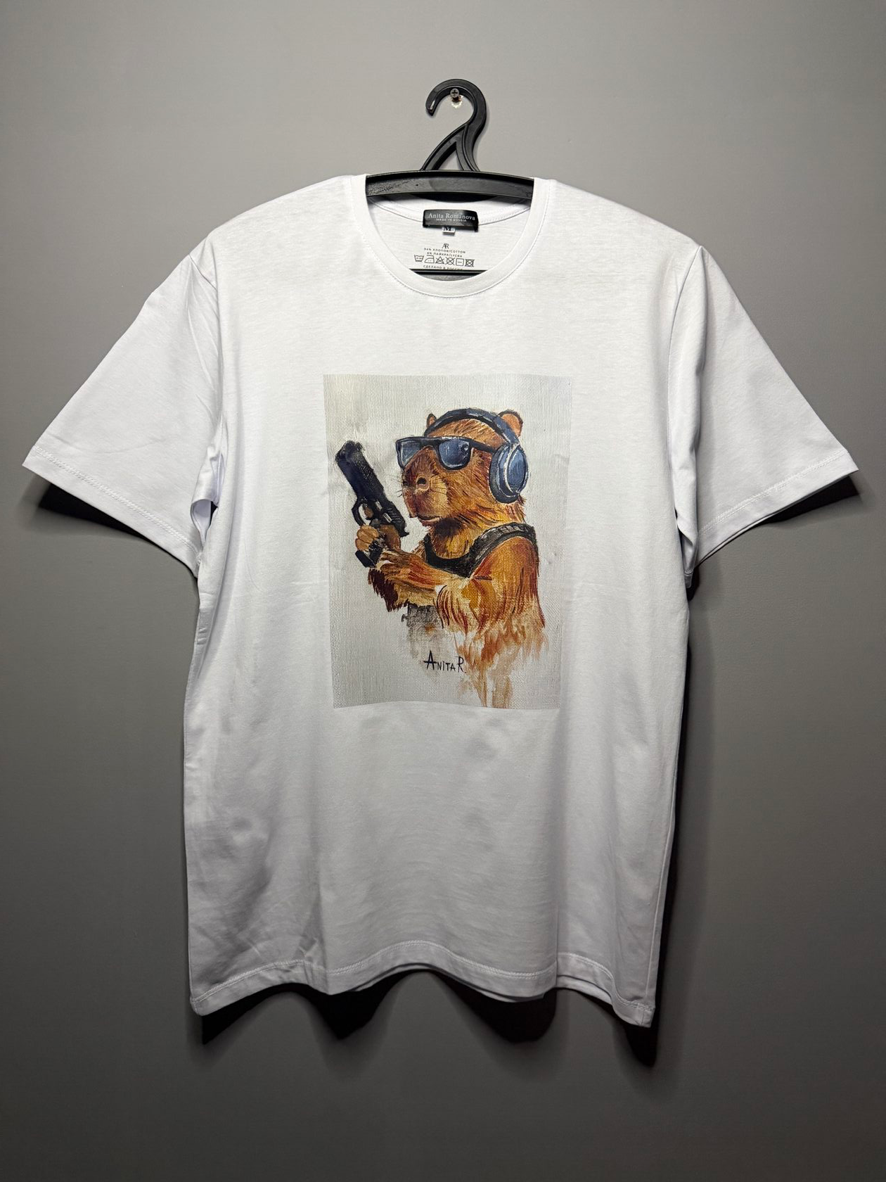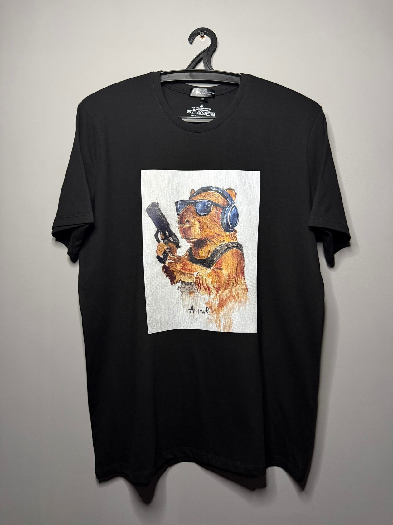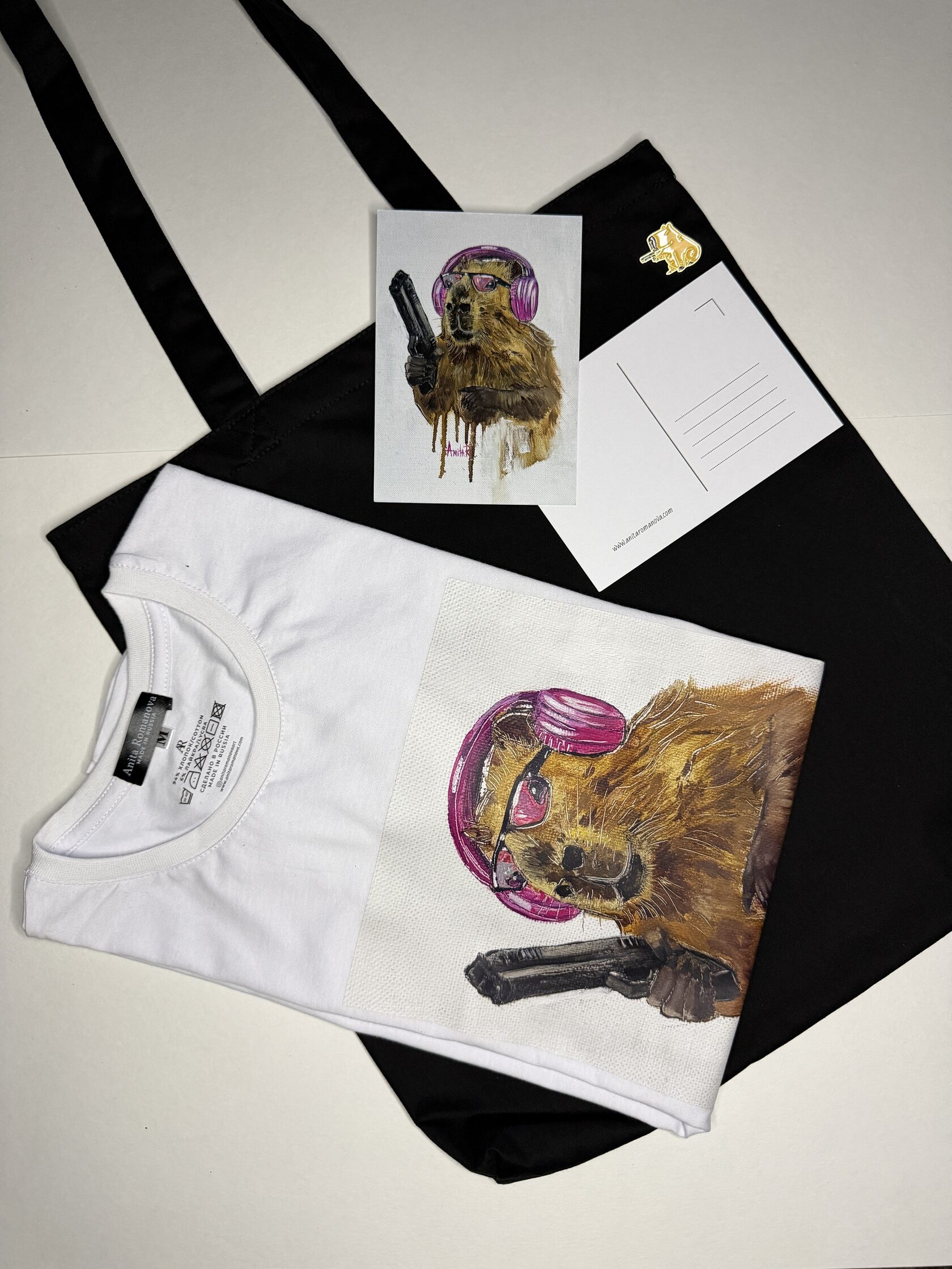 Комплектация товара: футболка, открытка с выбранным принтом, пакет zip-lock, шоппер, значок капибары.